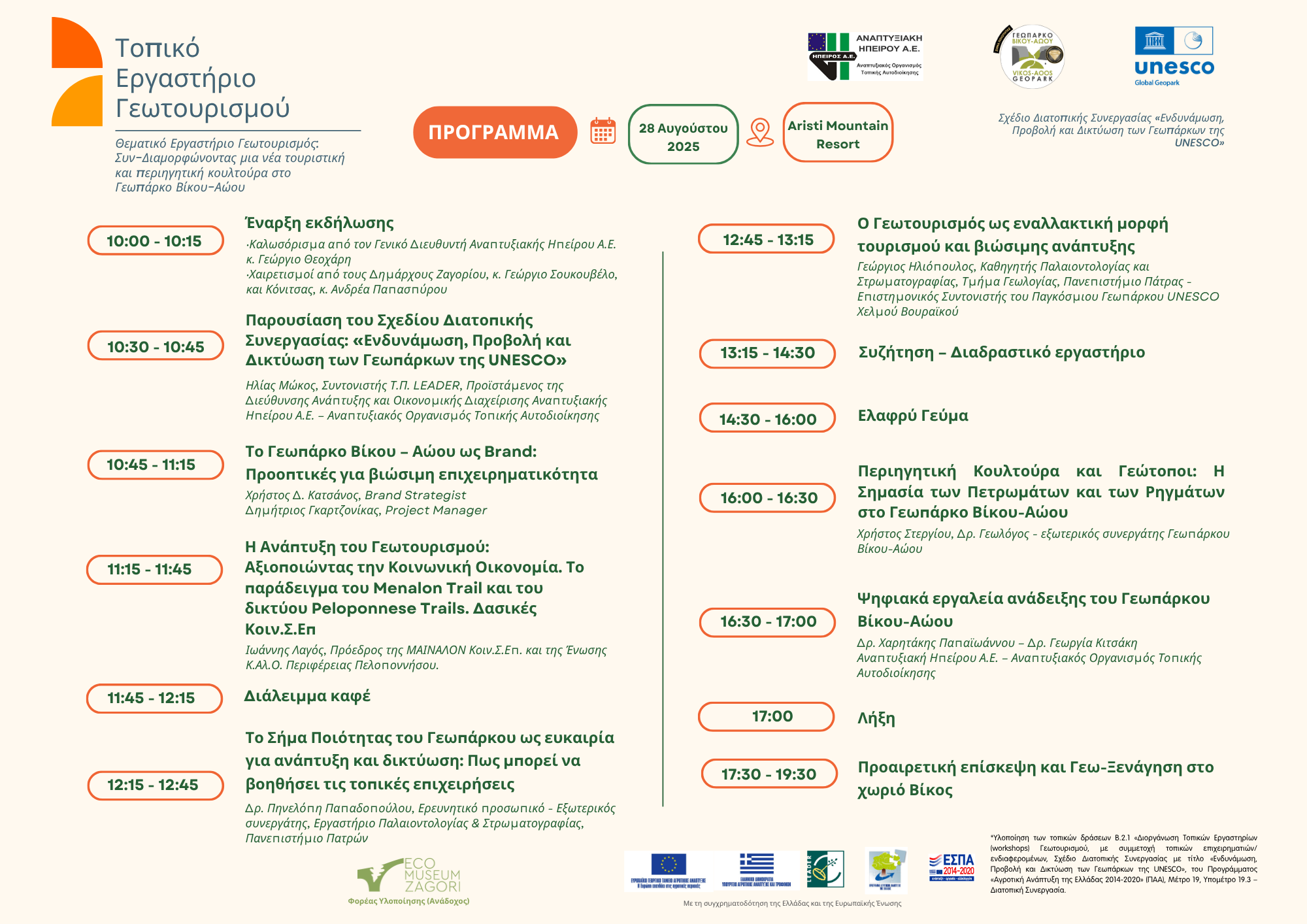 Στην Αρίστη Ζαγορίου φιλοξενήθηκε το Τοπικό Εργαστήριο Γεωτουρισμού, την Πέμπτη 28 Αυγούστου 2025, όπου επιχειρηματίες, φορείς και κάτοικοι αντάλλαξαν απόψεις για την ανάπτυξη του γεωτουρισμού και την ανάδειξη του Γεωπάρκου Βίκου – Αώου. Οι εισηγήσεις ειδικών επιστημόνων και επαγγελματιών ανέδειξαν ζητήματα όπως η δυναμική του τοπικού σήματος ποιότητας, η αξιοποίηση καλών πρακτικών από άλλα γεωπάρκα, η σημασία της γεωλογικής κληρονομιάς για την περιηγητική κουλτούρα, καθώς και τα νέα ψηφιακά εργαλεία που μπορούν να ενισχύσουν την προβολή και ερμηνεία των Γεωπάρκων σε εθνικό και διεθνές επίπεδο. Οι συμμετέχοντες ανέδειξαν την ανάγκη στενότερης συνεργασίας μεταξύ επιχειρήσεων και τοπικής κοινωνίας ώστε ο γεωτουρισμός να ενισχύσει την τοπική οικονομία με σεβασμό στο περιβάλλον.