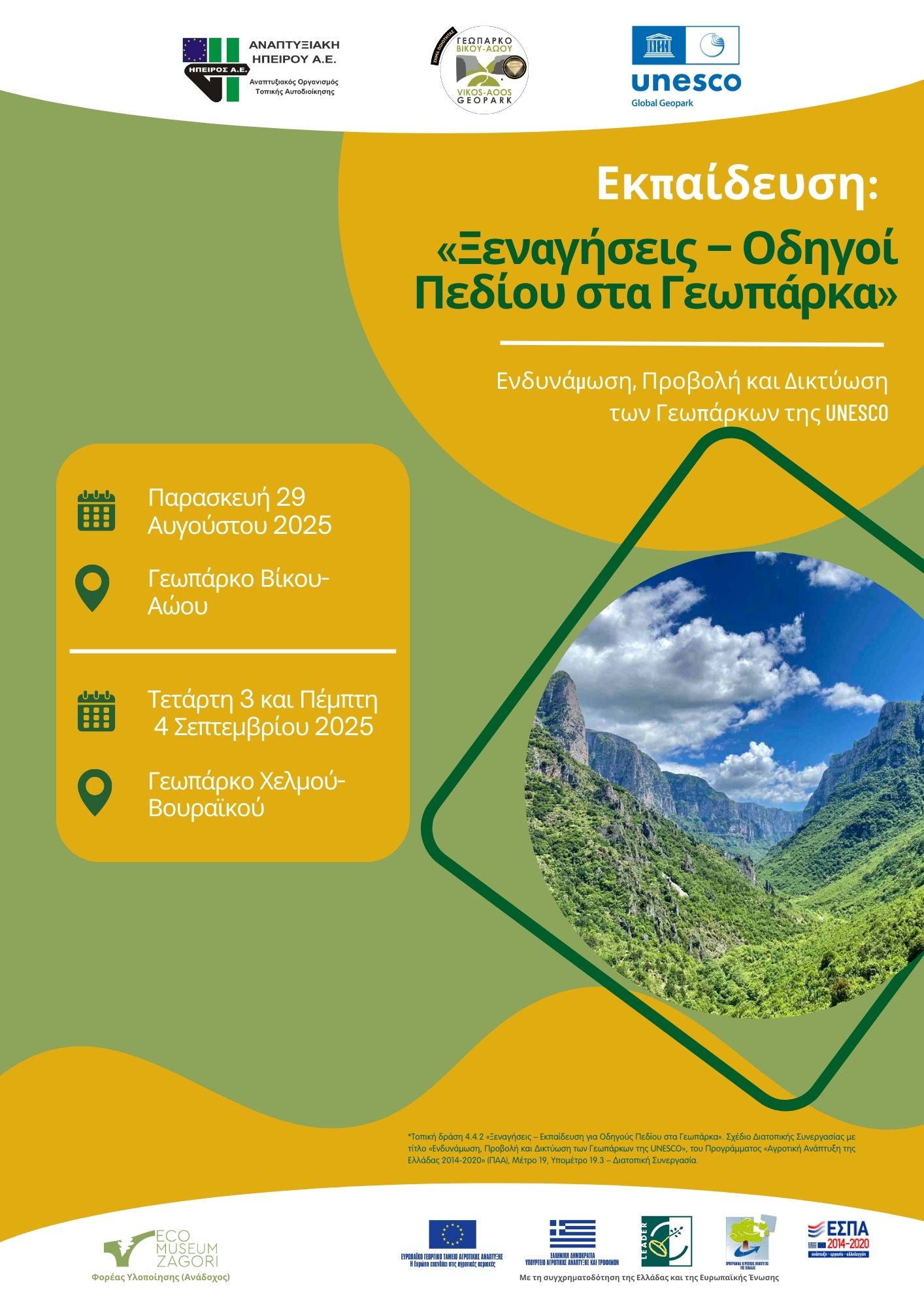 Με εξίσου μεγάλη συμμετοχή πραγματοποιήθηκε η εκπαίδευση Ξεναγών – Οδηγών Πεδίου στις 29 Αυγούστου στο Γεωπάρκο Βίκου – Αώου, με στόχο τη δικτύωση επαγγελματιών, την ανταλλαγή εμπειριών και την καλλιέργεια υπεύθυνης περιηγητικής κουλτούρας. Επαγγελματίες του τουρισμού, οδηγοί πεδίου και ενεργά μέλη συλλόγων είχαν την ευκαιρία να εκπαιδευτούν σε ζητήματα ξενάγησης, ερμηνείας του τοπίου και διαχείρισης φυσικών και πολιτιστικών πόρων, με επίκεντρο την σπουδαία γεωλογική κληρονομιά της περιοχής, υπό την καθοδήγηση του Δρ. Χρήστου Στεργίου και Δρ. Χαρητάκη Παπαϊωάννου. Το πρόγραμμα περιλάμβανε επισκέψεις σε χαρακτηριστικά σημεία του Γεωπάρκου, όπως ο ποταμός Βοϊδομάτης (Γέφυρα Κλειδωνιάς), η Γέφυρα Κόνιτσας, καθώς και η θέση θέασης Οξυά στο Μονοδένδρι, δίνοντας στους συμμετέχοντες τη δυνατότητα να συνδυάσουν την πρακτική άσκηση με την άμεση εμπειρία του φυσικού και πολιτιστικού τοπίου.
